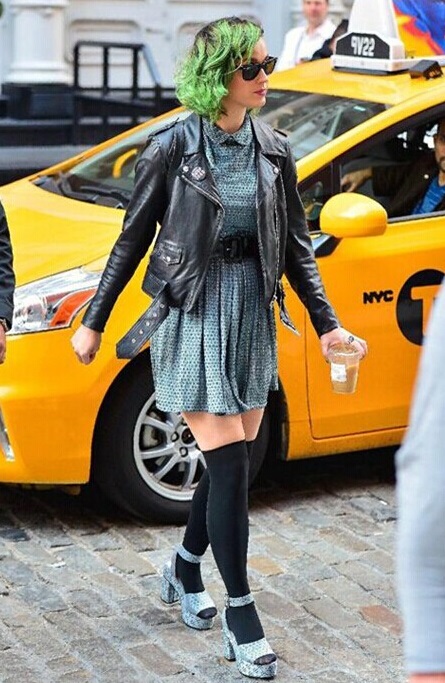 美国纽约,凯蒂·佩里(Katy Perry)着波点短裙皮夹克外套配黑长袜鱼嘴系带高跟鞋 一抹绿发出街越发醒目。