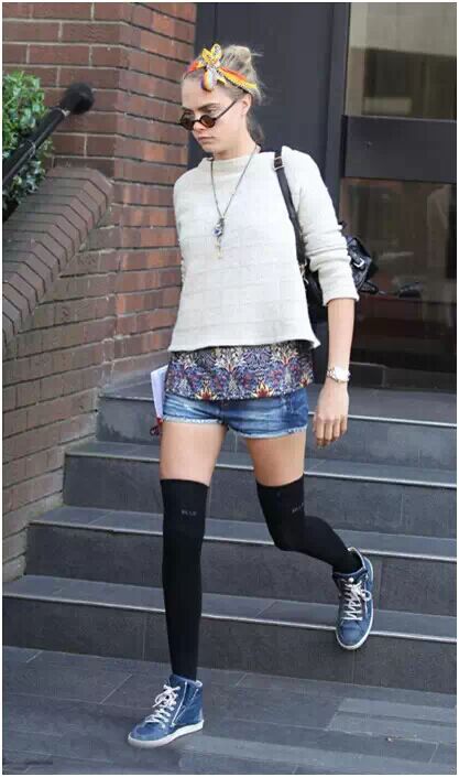 白色毛衫简单保暖,露出的印花内搭与头上发带呼应,牛仔短裤加上黑色长筒袜,卡拉·迪瓦伊(Cara Delevingne)的美腿一览无余!
