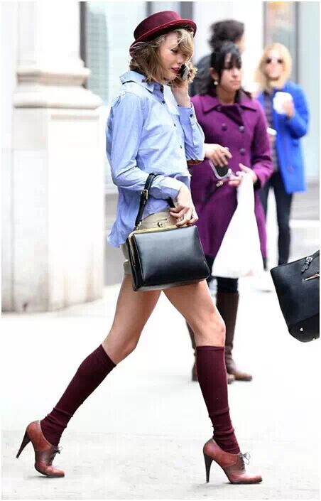 泰勒·斯威夫特(Taylor Swift)着蓝色衬衫搭超短热裤,休闲时髦,红色高筒袜和同色礼帽让人直呼性感。