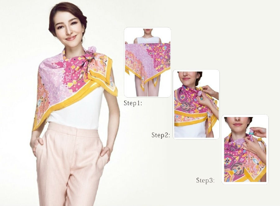 Step4:将丝巾扣放在胸前、两头绕于脖子后面系结,